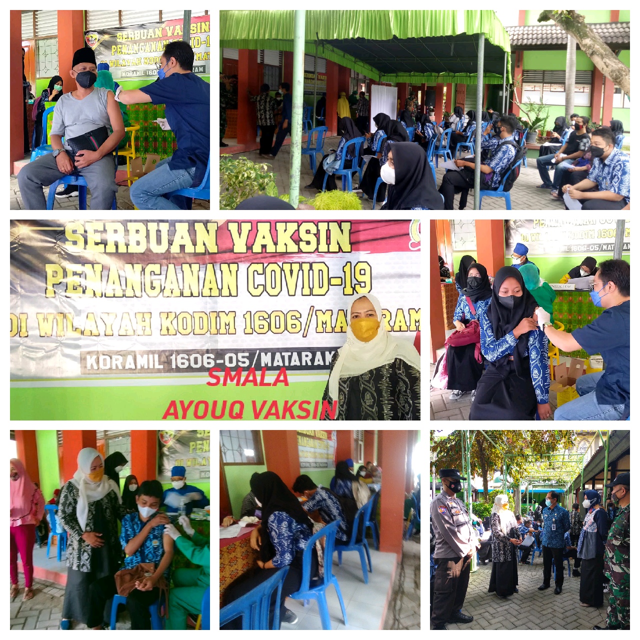 Giat serbuan Vaksin Penanganan Covid-19 Kodim 1606/Mataram-SMALA Hebat (SMA Negeri 5 Mataram) memberikan pelayanan vaksinasi dosis pertama maupun kedua untuk warga Smala Hebat dan masyarakat umum di Lapangan Sekolah SMA Negeri 5 Mataram, Kamis 30 September 2021. Siti Nurhani kepala Sekolah S...