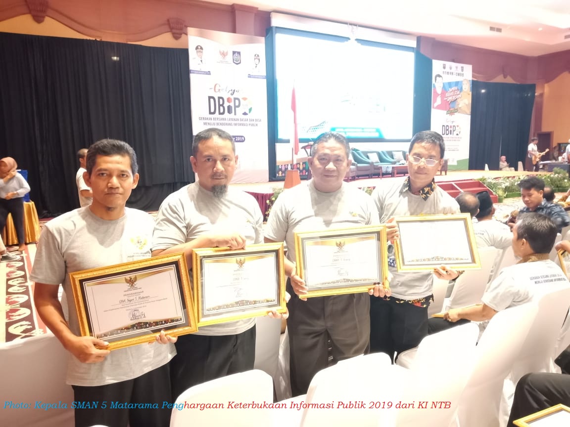 Mataram- Komisi Informasi (KI) Provinsi Nusa Tenggara Barat menggelar Penganugerahan Keterbukaan Informasi Publik kepada badan publik/PPID/OPD se-NTB di Hotel Lombok Raya Kamis (10/10/2019). Dalam acara ini, SMAN 5 Mataram berhasil meraih penghargaan atas Komitmen dan Konsistensinya dalam Impleme...